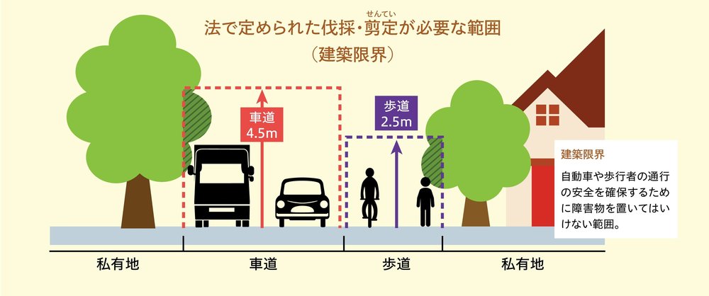 道路(車道や歩道)上に、私有地から樹木などが張り出し、道路利用者の通行の妨げになることがあります。