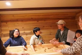 参加者の方に自身でDIYして作った酵素風呂を体験をしてもらいながら、3年間の活動について報告しました。