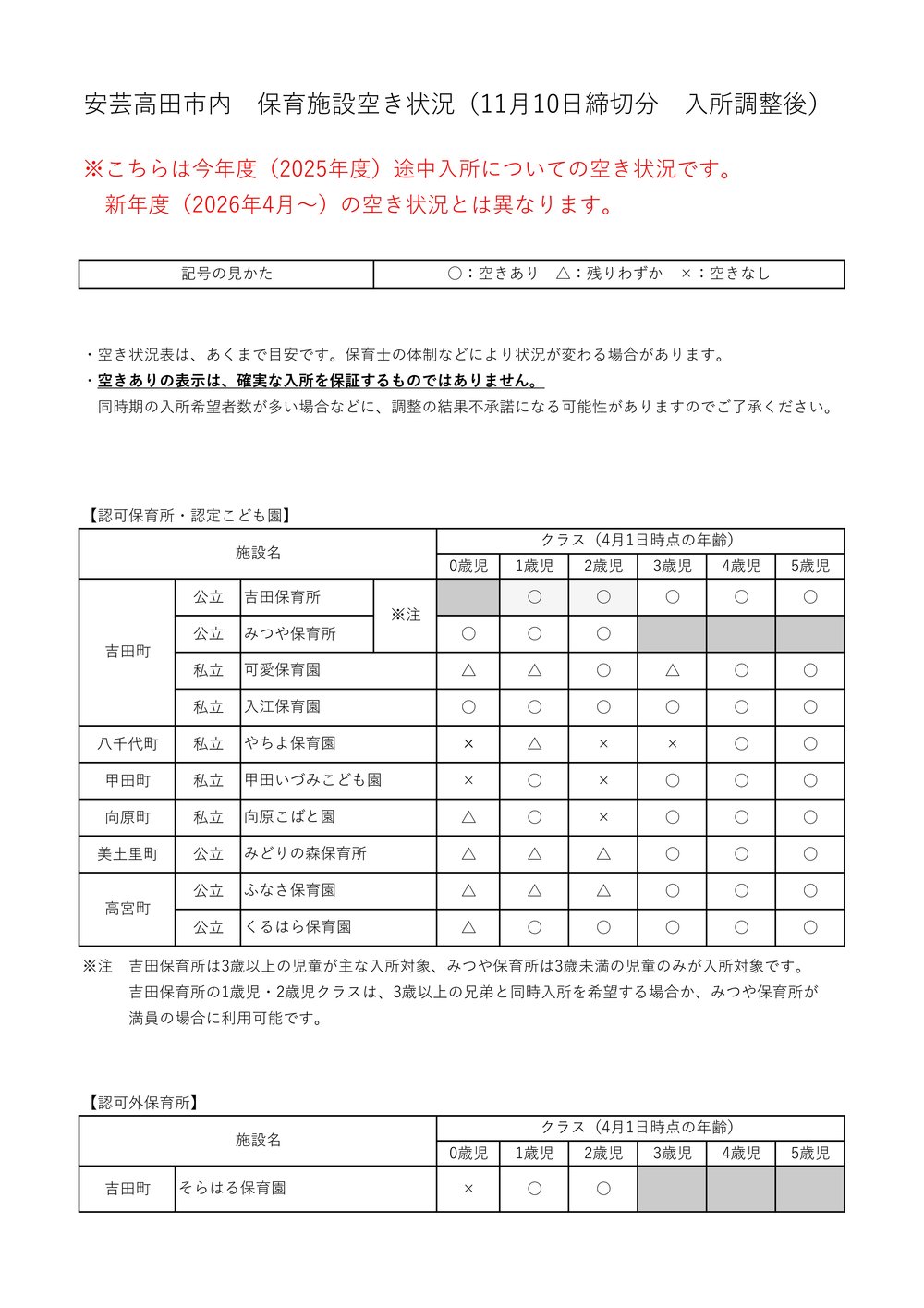 安芸高田市内の保育所・認定こども園の空き状況(2025年度入所)をお知らせします。
