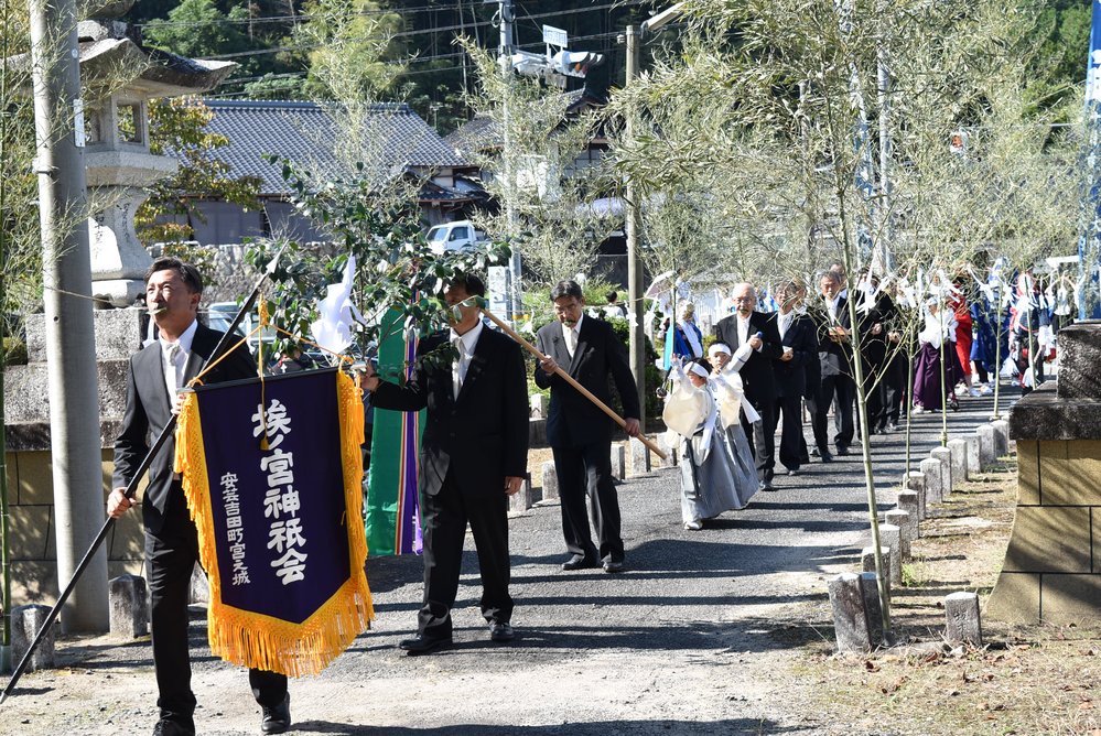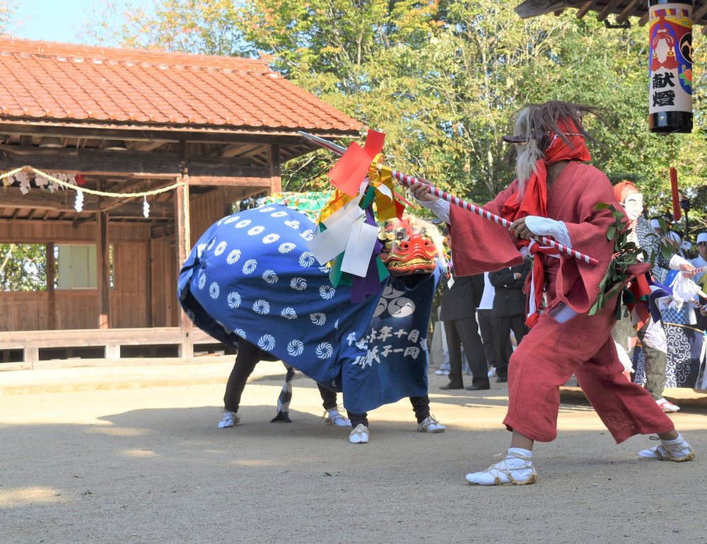 埃ノ宮神社神儀は吉田町川本埃ノ宮神社の秋祭りに、氏子中を川本・山手・下中馬の三当屋に分け、交代で奉納する秋祭りの行事です。古くから連綿としてつづけられ、猨田彦神を先頭に獅子・榊・供物・囃子・棒振り・氏子などが行列して参進し、献餅ののち、社前で獅子が舞い棒振りを演じます。特に棒振りは、この神儀独特のものです。