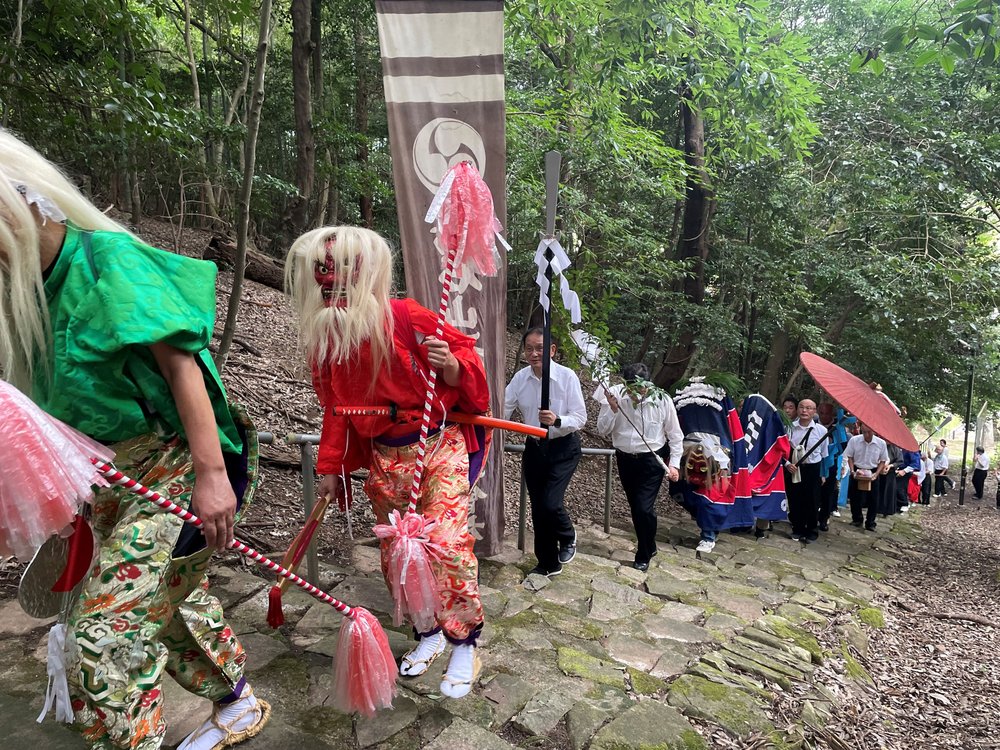 神社書上帳の記録によれば「御輿渡御は永禄の頃より始まり、今に絶えず」とあります。神祓は大祭式典終了後ただちに笛、太鼓の奏楽にあわせて御輿渡御(*1)と露祓い、悪魔祓いの舞が行われます。この舞は戸島12神楽に詳しく記載されていますが、供奉者(*2)は神官、悪魔祓い、露祓いをはじめ神饌(*3)、神具捧持者(*4)ならびに氏子総代、世話方などで社前より馬場をまわって正面参道(石段)を登り社前に帰ってきます。ここから奏楽が変わり、露祓い、悪魔祓いの「庭入りの舞」で神楽殿に進みます。神楽殿では他の奏楽に変わり、露祓い、悪魔祓いの順に別々に本舞が始まります。