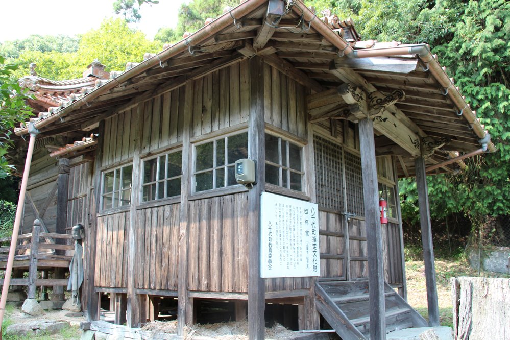 この小堂は自休観音堂ともいわれています。中世には品慶寺(本現寺ともいう)という寺院があり、僧自休の開基と伝わります。自休は室町時代の禅僧で、京都大徳寺の僧もしくは鎌倉建長寺の蔵主として、一休和尚とも交流があったともいわれています。周囲に五輪塔などを残しており、お堂の中には自休の位牌が安置されています。建物は、天和2年(1682)に八幡社として建立されたものを、宝暦9年(1759)に現在地へ移築したものと伝えられています。