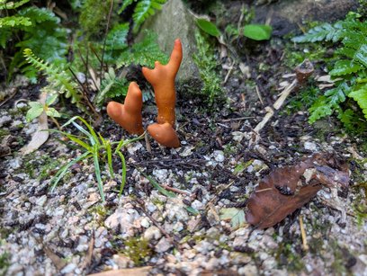 【形と色】表面はオレンジ色から赤色、細長い円柱状または棒状で、土から手の指が出ているように群生または単生する。