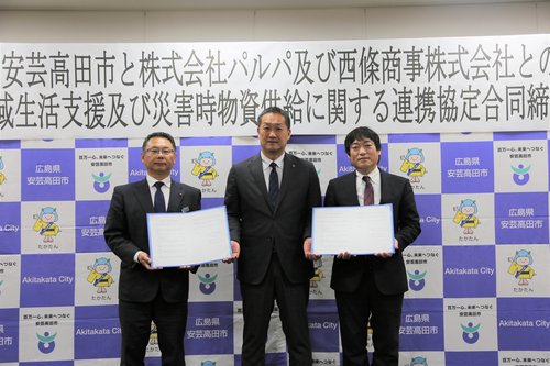 本市と株式会社パルパ、西條商事株式会社は、日常の買い物に不便を感じている地域への買い物支援策と高齢者等の見守り活動、さらに災害時における物資供給に係る3分野で連携する「地域生活支援支援及び災害時物資供給に関する連携協定」の締結を行いました。