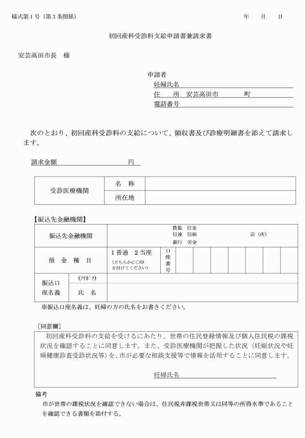 第3条 支給を受けようとする対象者(以下「申請者」という。)は、安芸高田市初回産科受診料支給申請書兼請求書(様式第1号)に医療機関が発行する初回の産科受診料の領収書及び診療明細書の原本並びに市が世帯の課税状況を確認できない場合は、住民税非課税世帯又は同等の所得水準であることを確認できる書類を添えて市長に提出しなければならない。