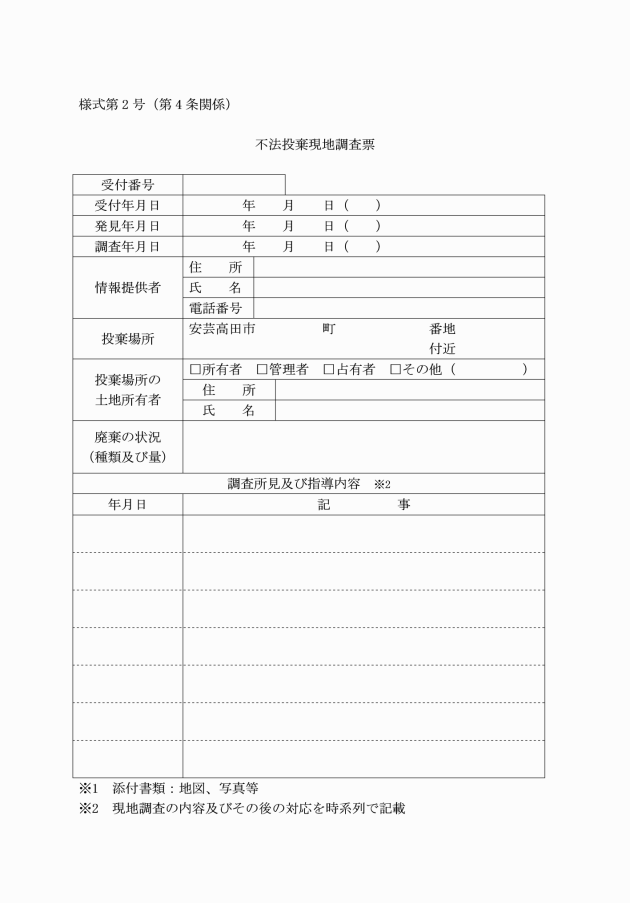 第4条 市長は、前条の規定により不法投棄に関する情報提供を受け付けたときは、速やかに関係職員を情報提供のあった不法投棄の発見場所へ派遣し、不法投棄された場所に立ち入り、不法投棄の種類及び量の調査その他必要な措置を講ずるものとする。